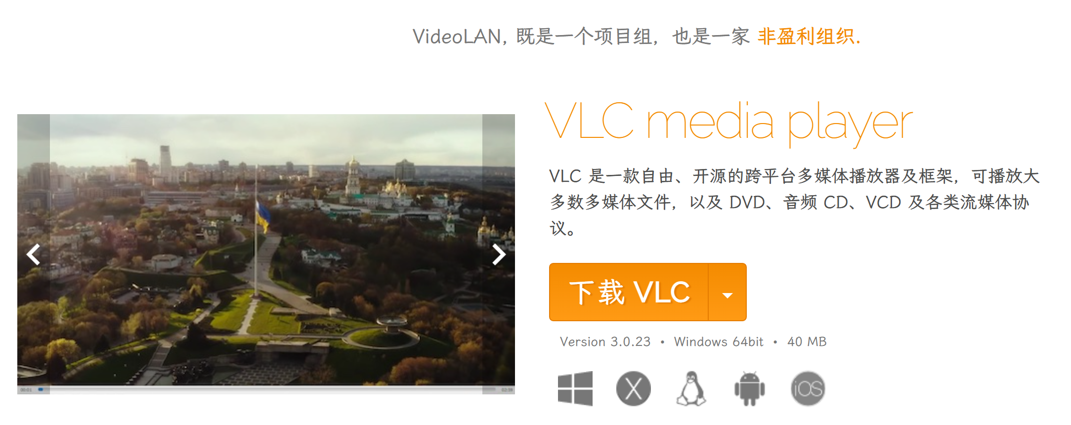 VLC 是一款免费开源的视频播放器,无广告无捆绑,安装包只有40MB,还支持多平台,包括 Windows、 Linux、Mac OS 、 iOS、 Unix、Android,功能十分强大,目前已有 2 亿多下载量!