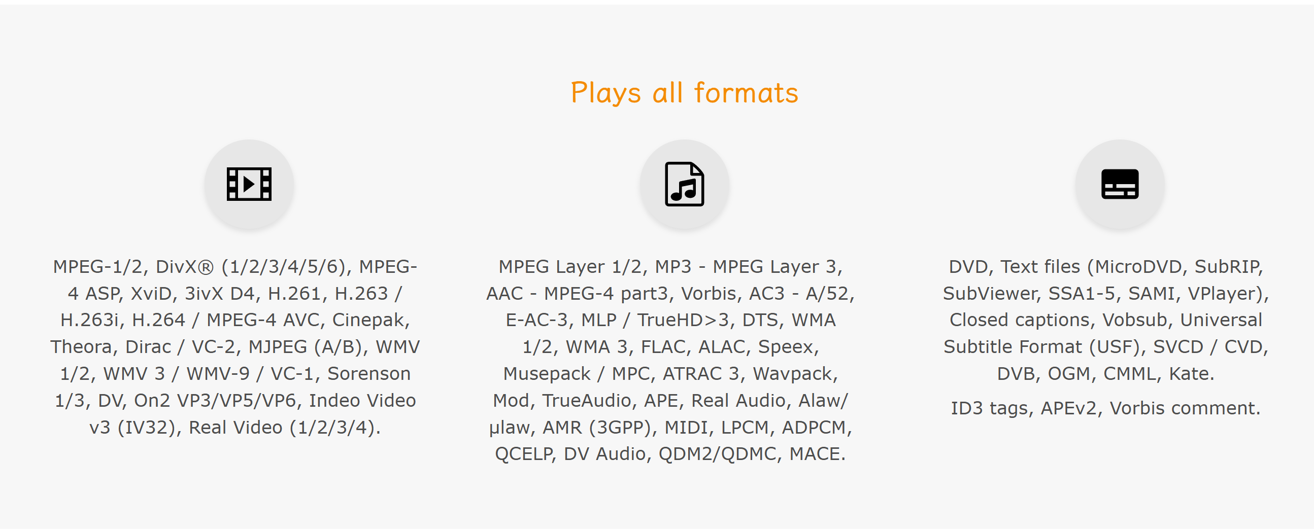 VLC 内置的解码器也很厉害,无需手动安装解码包,就可以播放绝大多数的视频,像是 MPEG-2、 MPEG-4、 H.264,、MKV、 WebM、 WMV、DivX、DVD/VCD、MP3 等等编码的视频都可以播放。